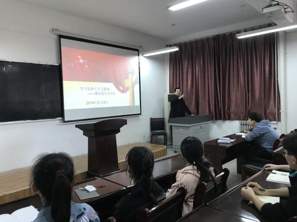 3月14日下午,院团委书记林伟在11教322为团学干部作了题为“学习党的十九大精神——做奋进有为青年”的专题报告,回顾了十九大报告的重点内容,以及过去五年来取得的重要成就,号召全体团学干部要争做六有青年,要奋进中寻找自身不足,成为祖国发展的可靠力量。