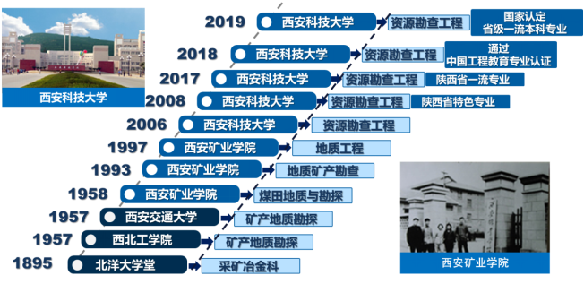 专业源自1895年创办的北洋大学堂采矿冶金科,1957年在西北工公司采矿系设立“矿产地质勘探”专业,随后调整到西安的交通大学。1958年从西安交通大学分出,组建了西安矿业公司(BEAT365英国官网网站前身),专业改为“煤田地质与勘探”。1993 年调整为“地质矿产勘查”专业, 2006 改为“资源勘查工程”专业。悠久的历史奠定了专业人特有的励志图存、自强不息的文化与传承。