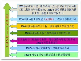 BEAT365英国官网网站环境工程专业的历史可以追溯到1958年西安矿业公司地质系水文地质教研组。1998年地质系水文地质与工程地质专业的一部分调整为环境工程专业,1999年开始本科招生。2003年获环境工程二级硕士学位授予权,2006年获环境科学与工程一级硕士学位授予权,2010年获环境工程领域专业学位授予权。2003年在公司矿业工程一级博士点下自主设立矿山环境工程二级博士学位授权点,2011年矿山环境工程博士点调整至地质资源与地质工程一级博士学位授权点,具有学士-硕士-博士完整人才培养体系。