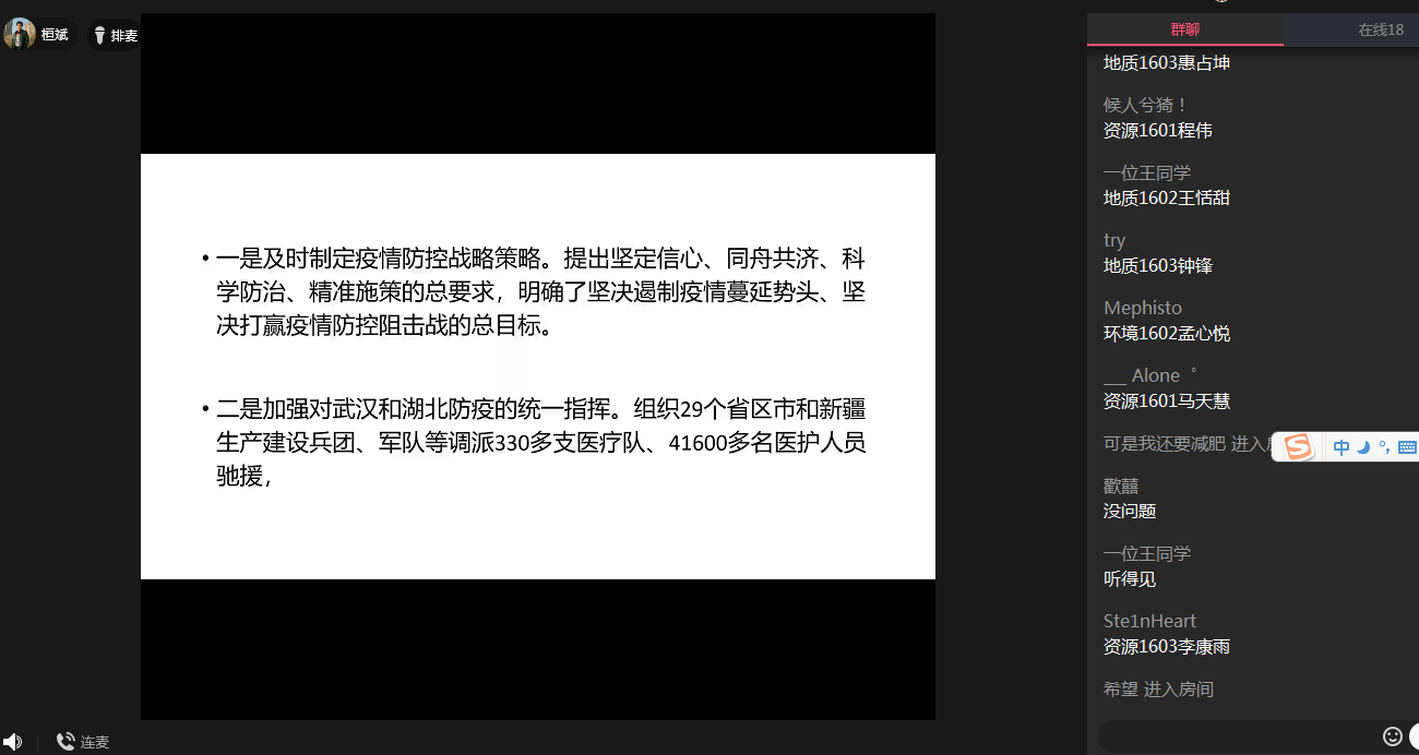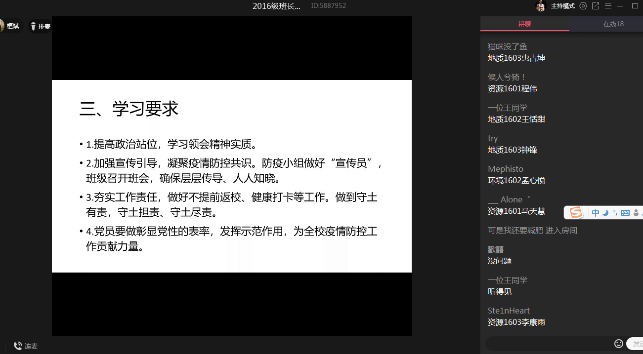 林伟强调年级疫情防控小组要提高政治站位,领会习近平总书记讲话精神实质,落实公司防疫举措,做好班级的“宣传员”。小组成员夯实工作责任,党员要做彰显党性的表率,发挥示范作用主动带头做好不提前返校、健康打卡等工作,积极关心班级同学,及时反馈员工问题,开展心理疏导、情绪支持。各小组按照公司防控工作安排,结合本班具体实际,各班利用在线技术,通过学习强国、QQ群视频会议集中学习研讨,为全校疫情防控工作贡献力量。