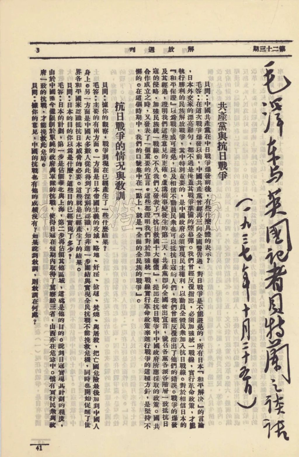1937年10月25日,毛泽东与英国记者贝特兰的谈话。