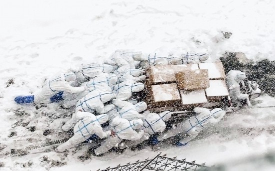 2020年12月,为应对新冠肺炎疫情,大连海洋大学决定封闭校园,员工在宿舍隔离。该校17名平均年龄19岁的热血青年,选择加入志愿者队伍,与教职工志愿者一起负责公寓区域师生生活和防疫物资的统一配送。图为志愿者们推着满载的三轮车上坡,将物资送到员工宿舍。 新华社发 大连海洋大学供图