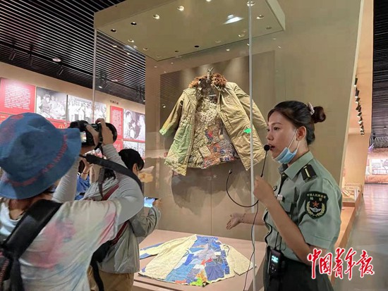 8月6日,新疆生产建设兵团军垦博物馆讲解员讲述缝满296个补丁的军大衣背后的故事。中青报·中青网记者 王雪迎/摄