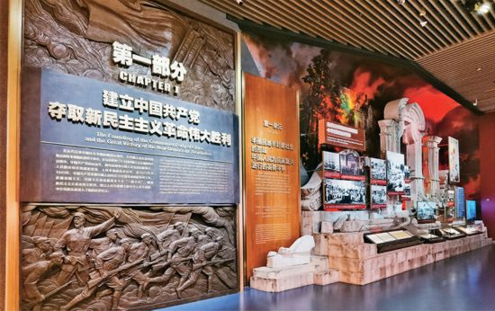 2021年6月18日上午,一座永久性、综合性的党史展览馆——中国共产党历史展览馆在首都北京正式开馆。同日下午,习近平总书记等党和国家领导人到这里参观“‘不忘初心、牢记使命’中国共产党历史展览”。图为展览的第一部分,展示新民主主义革命的伟大成就。 中国共产党历史展览馆供图