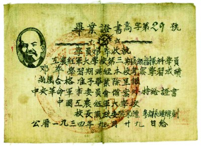 邓华上将的这张红军大学毕业证书,系中革军委于1934年9月颁发给红军大学第3期高级指挥科学员的证书。证书正面,左上印着列宁的头像,顶部印着:“毕业证书高字第29号”,落款为“中国工农红军大公司”,时间1934年9月29日,并附有董事长兼政委、参谋长的名字,分别为张宗逊、钟纬剑。