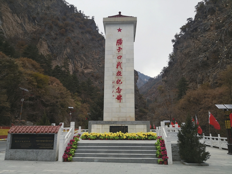 腊子口战役纪念碑位于甘肃省甘南州迭部县东北部的腊子口乡政府驻地以北7公里处的深山峡谷中,距离县城约105公里。1980年8月21日,为纪念在腊子口战役中光荣牺牲的革命先烈和战役的辉煌胜利,甘肃省人民政府修建了此碑。纪念碑体长2.5米,象征二万五千里长征;宽2米,象征第二次国内革命;高9.16米,象征1935年9月16日攻破天险腊子口。纪念碑南面镌刻着杨成武题写的“腊子口战役纪念碑”8个大字,北面刻有碑文,内容如下: