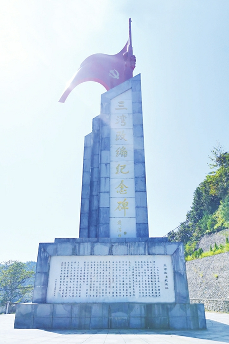 在距离江西省永新县城约40公里的三湾村,三湾改编纪念馆掩映在青山绿水中,右侧为5层4面构成的186级台阶,寓意起义部队在三湾村休整了5天4夜。拾级而上,雄伟庄重的三湾改编纪念碑便映入眼帘。纪念碑由碑顶、碑身、碑座、台基四部分组成,碑体高度19.27米,代表三湾改编这一重大历史事件发生的年份是1927年。碑顶上,一只遒劲有力的大手紧握钢枪,枪口直指苍穹、傲视群山。碑身正面镶嵌着迟浩田撰写的“三湾改编纪念碑”7个镏金大字。碑座侧面为大型人物花岗岩浮雕,正面为汉白玉碑石,刻有三湾改编纪念碑文。碑文如下: