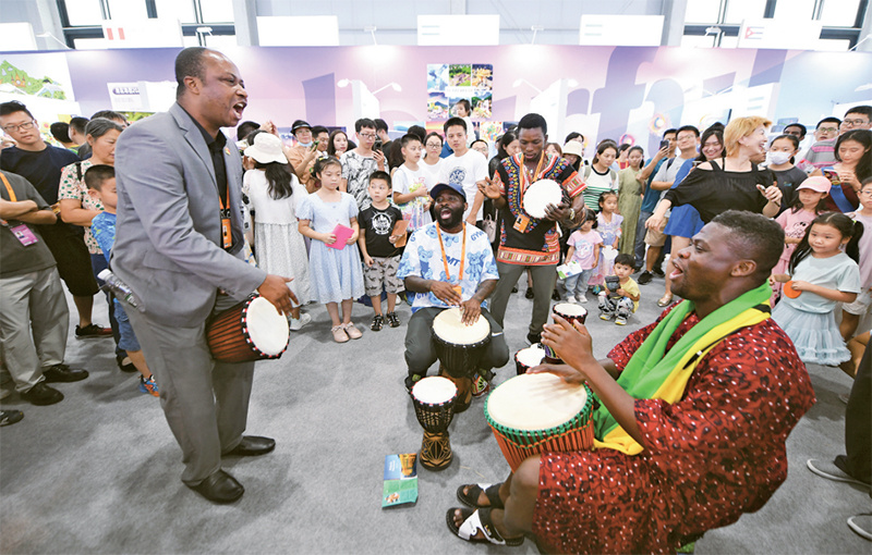 2023年中国国际服务贸易交易会上举办“一带一路”共建国家特色文化展示活动,通过特色文艺演出、文化推介、护照打卡等一系列活动,展现共建国家文化风采。图为展示活动上,加纳共和国驻华大使馆展区的工作人员在现场即兴表演。新华社记者 鞠焕宗摄