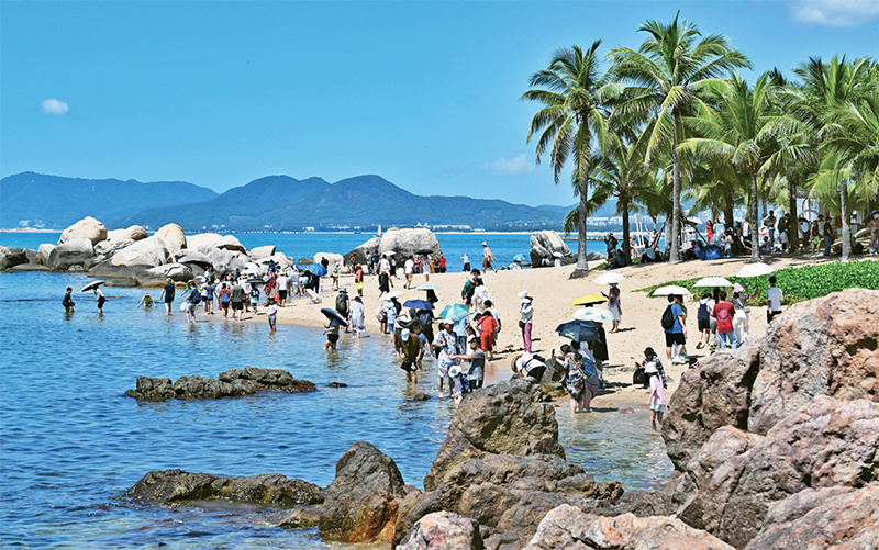 我国经济社会全面恢复常态化运行以来,消费回暖跑出“加速度”,成为经济增长的主拉动力。图为2023年10月1日,游客在三亚市天涯海角游览区游玩。新华社记者 郭程摄