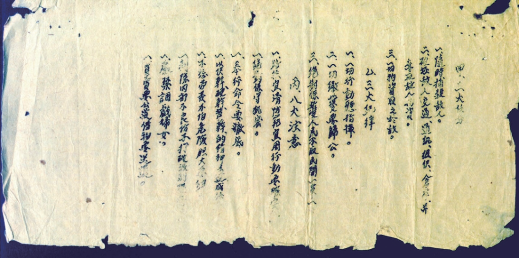 赣南苏区时期纸质手刻油印“三大任务、三大纪律、八大注意”宣传单。