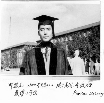 1945年夏,他从西南联合大学毕业后,在北京大学物理系任教。1948年赴美国印第安纳州普渡大学留学,用二十三个月就取得博士学位。出国前他对好友说:“将来祖国建设需要人才,我一定学成回来。”1950年8月29日,获得博士学位后第九天,邓稼先同志响应党和国家号召,毅然登上归国的客轮。回国后在中国科公司近代物理研究所、原子能研究所从事原子核研究工作,为我国核理论研究做出了开创性工作。1956年4月光荣加入中国共产党。