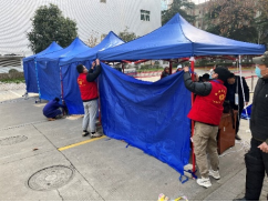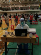 地环学院志愿者们身着“红甲”,协助采样工作,维持队伍秩序,提醒队伍间距,并在人群散去后积极参与对校园进行全方位、无死角的消杀。