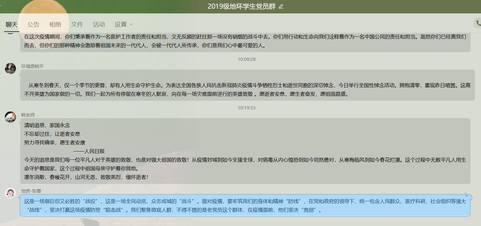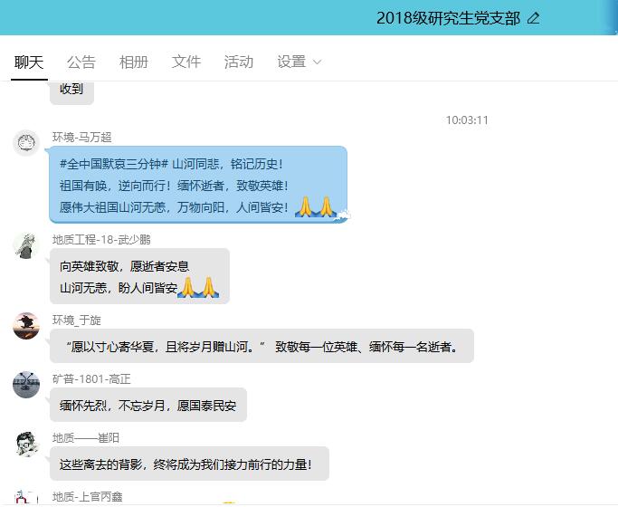 4月4日上午,beats365唯一官方网站2019级研究生党支部通过网络视频会议的形式,集体观看中央电视台全国性哀悼活动现场直播。10时整,全国各地空防空警报鸣响,全体党员庄严默哀三分钟,并通过实时视频发表感想及网上留言的形式,表达深切哀悼。同时,2017级、2018级研究生党支部通过线上讨论留言及微信朋友圈深切哀悼新冠肺炎疫情牺牲烈士和逝世同胞,寄托哀思。