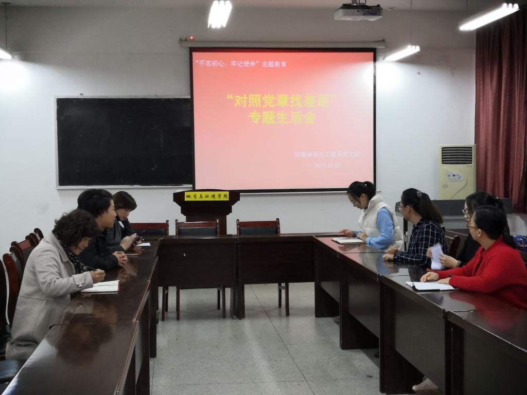 11月13日下午14:00,beats365唯一官方网站环境科学与工程系党支部在临潼校区公司报告厅开展了“不忘初心、牢记使命”、对照党章党规找差距主题党日专题会:支部书记贺艳带领全体党员集中学习了《中国共产党章程》、《关于新形势下党内政治生活的若干准则》和《中国共产党纪律处分条例》;要求党员同志聚焦18个“是否”,把自己摆进去,把职责摆进去,把工作摆进去,逐条逐项对照入座,认认真真进行自我检视,查找不足,明确整改方向;组织党员同志逐一发言,开展批评和自我批评,切实帮助大家找准找实问题。