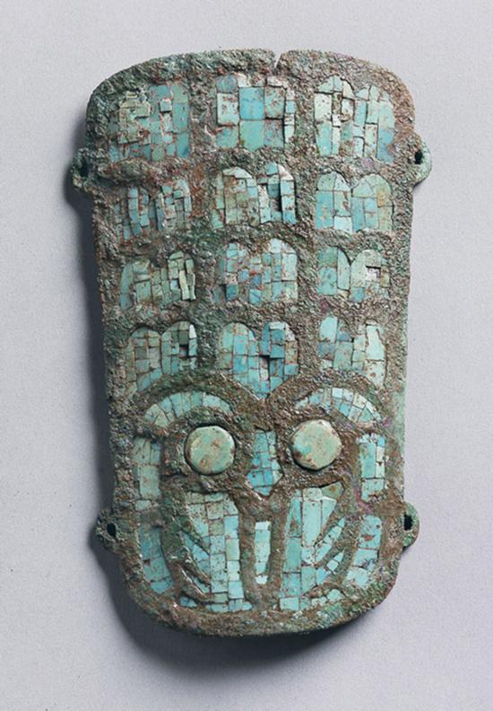 二里头遗址,全国重点文物保护单位,中华文明探源工程首批重点六大都邑之一。遗址位于河南省洛阳市偃师区西南9公里外的伊洛河故道北沿(今洛河之南),其年代约为距今3800~3500年。二里头遗址是探索中国早期文明和国家起源,研究夏文化、夏商王朝纪年及其分界的关键性遗址。图为二里头文化镶嵌绿松石兽面纹青铜牌饰,牌饰的兽面纹开创了后代商周青铜器兽面纹母题的先河。 国家文物局供图