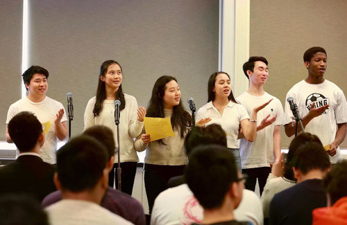2019年4月3日,在美国伊利诺伊州北奈尔斯市,北奈尔斯高中的员工们现场中文朗诵唐代诗人李白的《静夜思》和孟浩然的《春晓》