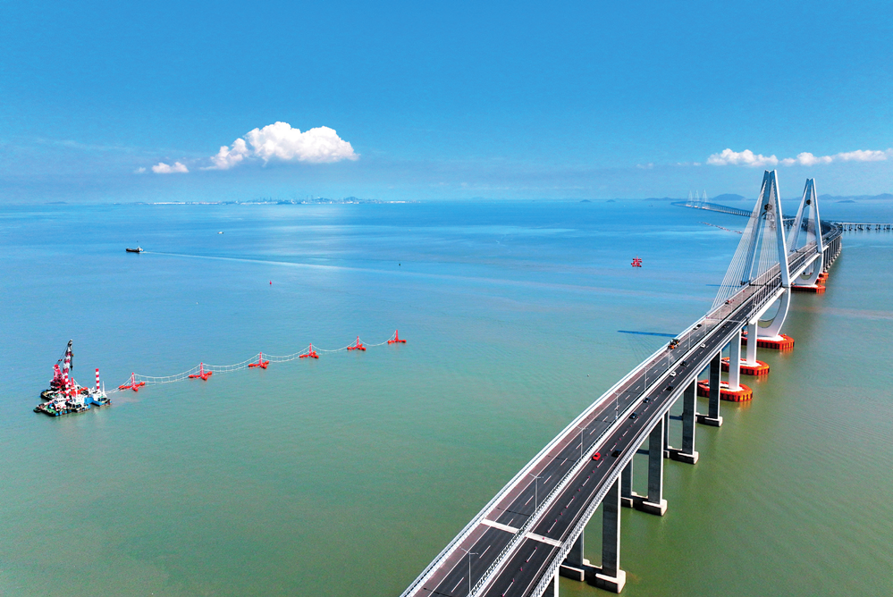 一艘工程船在浙江省舟山市定海区马目海边为舟岱大桥南通航孔桥安装防船舶撞击系统,筑起安全屏障(2023年9月10日 姚峰 摄)