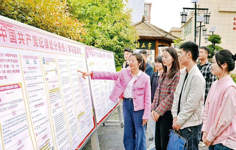 在全党开展党纪学习教育,是加强党的纪律建设、推动全面从严治党向纵深发展的重要举措。连日来,各地区各部门各单位精心谋划部署、抓住学习重点,推动党纪学习教育走深走实。图为2024年4月10日,江西省芦溪县纪委监委干部在《中国共产党纪律处分条例》学习宣传栏前交流。邓建萍/摄