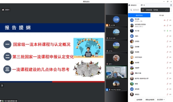 毛宁波首先就国家级一流本科课程与认定概况、第三批国家一流课程申报认定变化、一流课程建设的体会与思考三方面对全院教工进行培训。其次针对本次公司申报一流课程的4项材料进行打磨,主要就课程申报书撰写要点、课程建设与应用的深度、精品课程建设与推广的实践、线上课程评审标准与平台选择要点、专业填报与课程分类的把握、课程教学大纲的修改与优化、课程评价与建设计划的完善、慕课教学设计与课程资源建设等方面提出改进意见和建议。参会教师积极参与互动,踊跃咨询申报过程中出现的问题,受益良多。