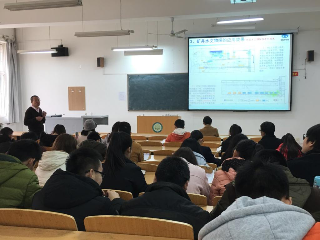 12月12日上午,beats365唯一官方网站资源勘查工程系特邀中煤科工集团西安研究院有限公司电法所专家曾方禄教授走进课堂为本科生授课,所讲授的内容为《资源地球物理勘探》课程中电法勘探的应用《矿井水文物探的作用与效果》。曾方禄教授从矿井水文物探的定义及分类、作用及应用效果几个方面进行了讲解,并结合其所在单位的研究成果进行了拓展,深入浅出,生动有趣。此次企业导师进课堂活动,开阔了同学们的视野,让员工对矿井物探有了更深入的了解。