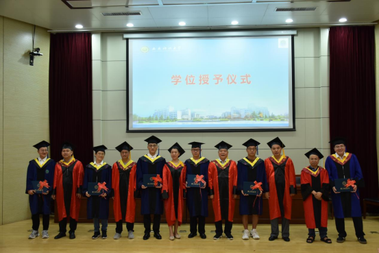 学位授予仪式上,全体毕业生依次登台,公司学位分委员会委员为获得研究生学位的毕业生正冠拨穗,授予学位证书,并合影留念。