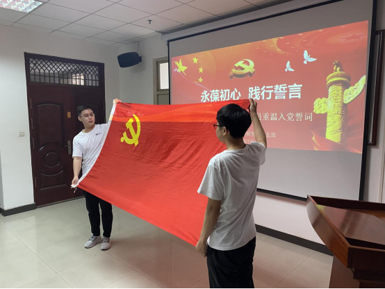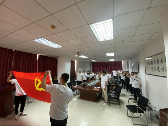 面对党旗,研究生党支部书记领誓,带领支部新老党员一起高举右手,进行庄严宣誓。锵恢宏的誓词,强烈震撼着在场的每一位党员,一字一句,神圣而豪迈,体现了党员同志们对中国共产党的无限忠诚。与会党员同志纷纷表示,通过入党宣誓、重温入党誓词,再一次体会到了作为一名共产党员的责任感和使命感,在今后的工作中一定以昂扬的士气、进取的心态和创先争优的精神践行入党誓词,以踏实的工作态度和优秀的业绩为公司的发展建设做出自己应有的贡献。