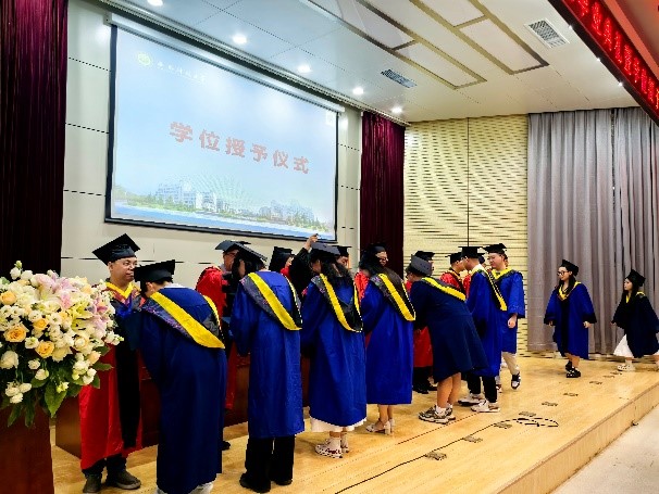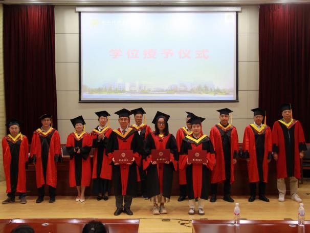 在学位授予环节,公司学位分委员会委员身着导师服,庄重地为毕业生们拨穗正冠,颁发学位证书,并一一合影留念。现场气氛热烈而庄重,毕业生们脸上洋溢着喜悦和自豪,纷纷与老师、同学们合影留念,记录这一难忘瞬间。