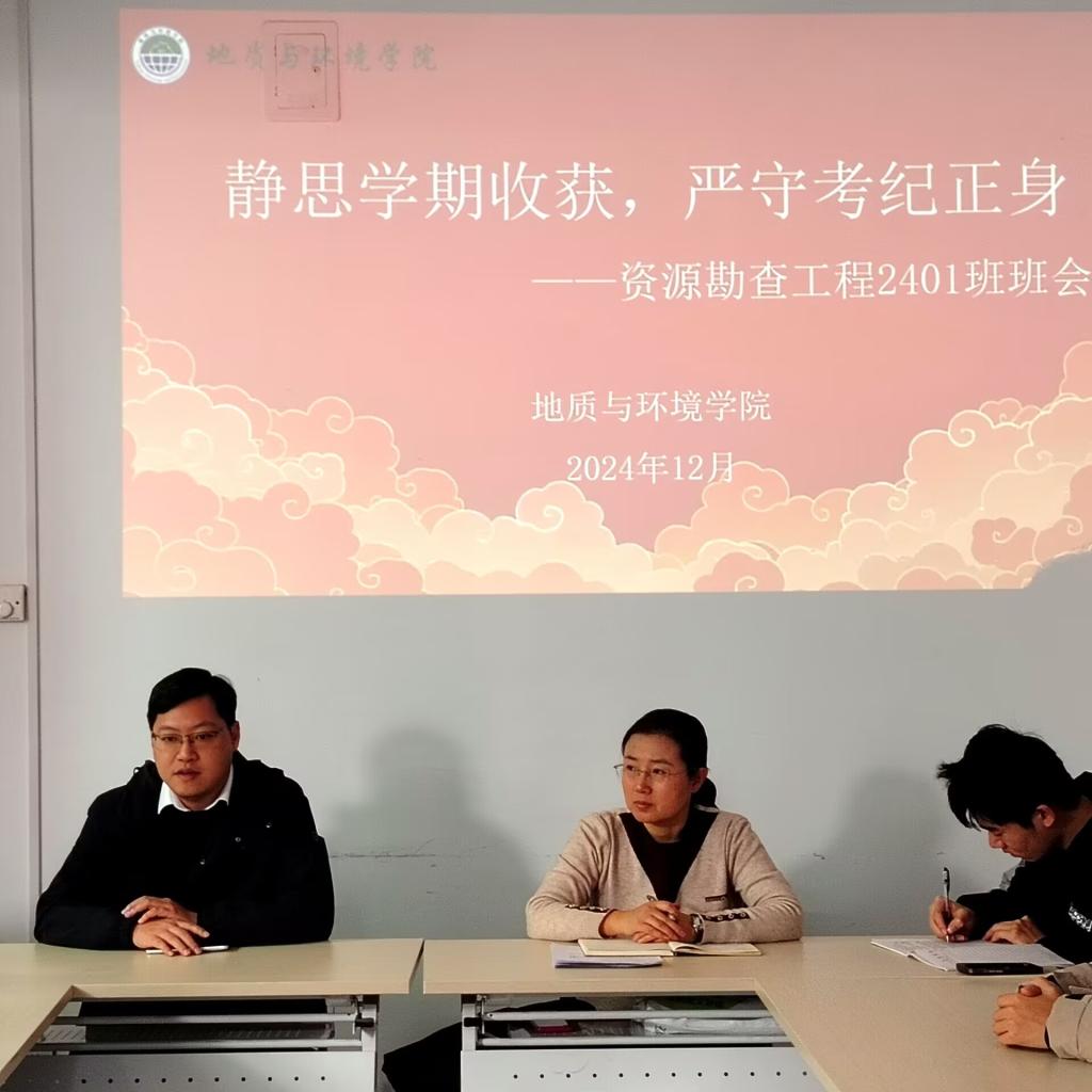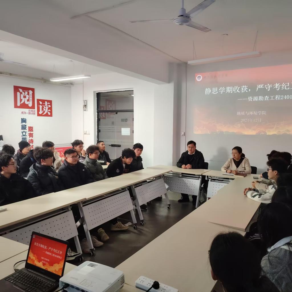 12月17日,资源勘查工程2401班班主任陈跃老师深入“一站式”员工社区召开“静思学期所获,严守考纪正身”主题班会,资源勘查工程2401班全体员工参会,辅导员李琳主持。