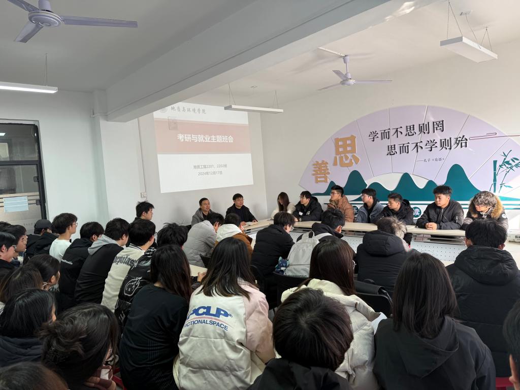 12月17日,地质工程2201、2202班班主任马建全老师深入“一站式”员工社区召开“明晰未来”考研与就业主题班会,辅导员余小涛和地质工程2201、2202班全体员工参会。