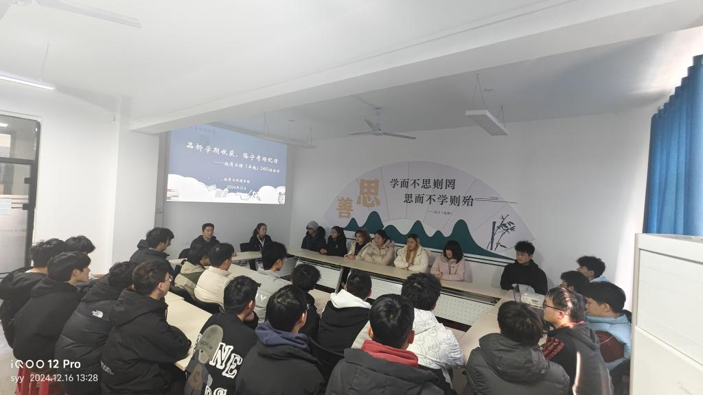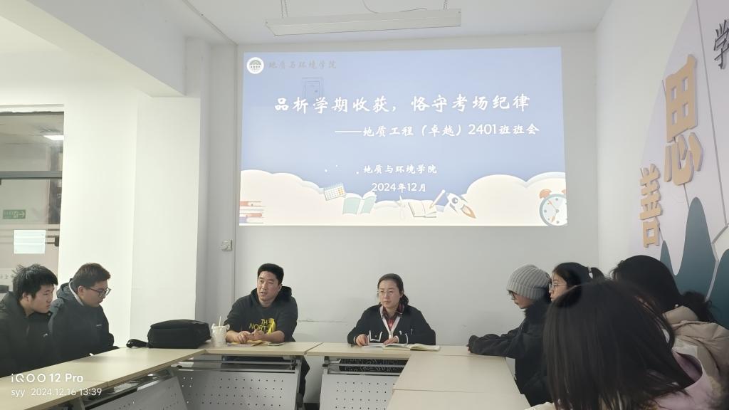 12月13日,地质工程(卓越)2401班班主任唐皓老师深入“一站式”员工社区召开“品析学期收获,恪守考场纪律”主题班会,辅导员李琳和地质工程(卓越)2401班全体员工参会。