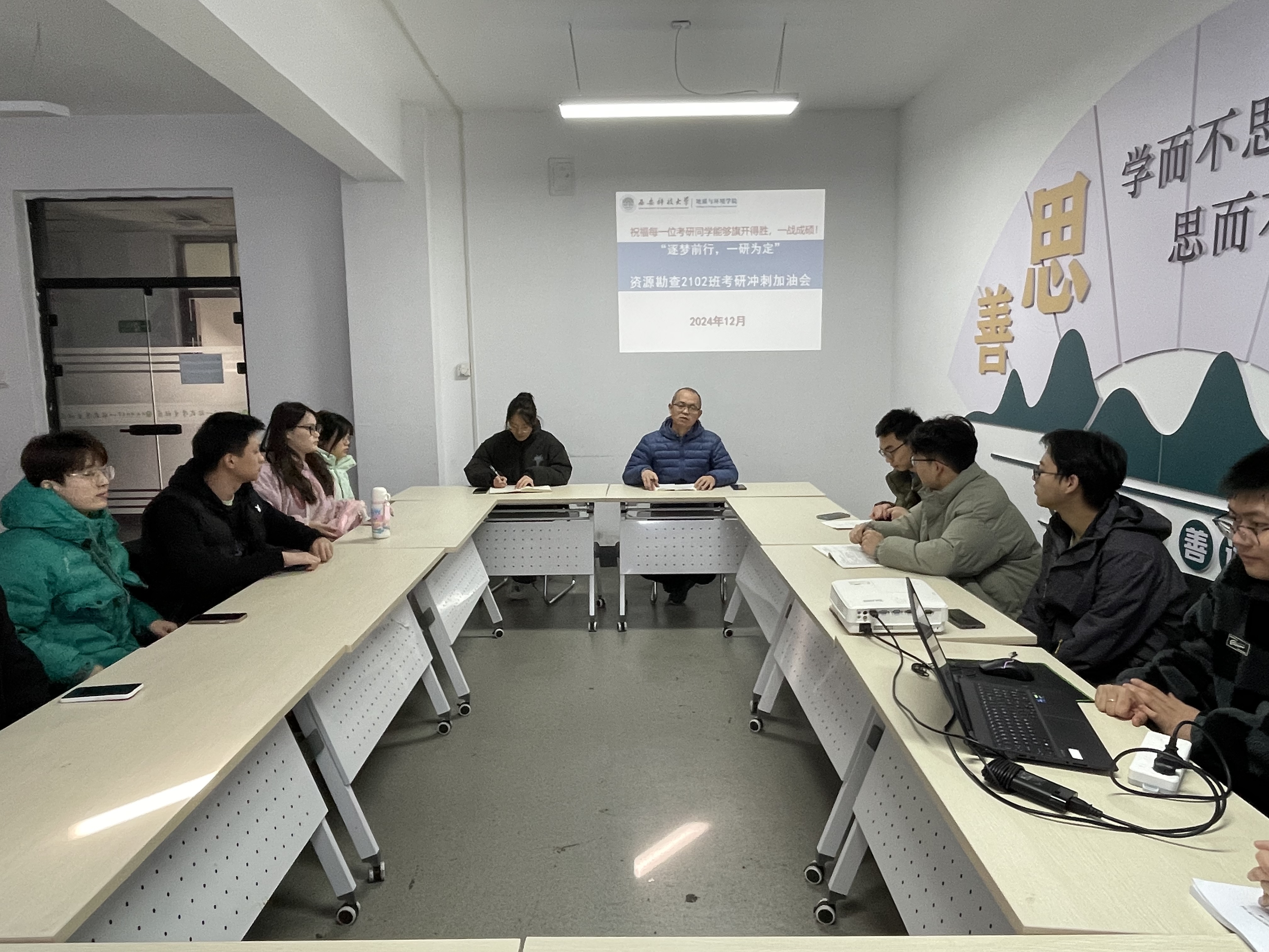 为助力员工学业发展,营造优良学习生活氛围,12月13日中午,资源勘查2102班班主任蔺亚兵于beats365唯一官方网站一站式员工社区组织开展了“考研冲刺动员”主题班会。
