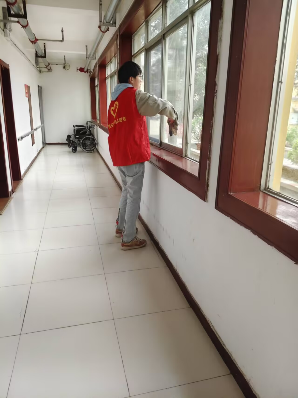 志愿者们乘坐大巴车抵达金秋敬老院后,随即分为两组展开志愿服务:一组同学轻步走入老人居住区,与长辈们亲切交谈、暖心慰问,欢声笑语间,阳光般的笑意绽放于每一张镌刻着岁月痕迹的面庞;另一组同学则手持扫帚、拖把与抹布,认真清扫每一寸地面,细心擦拭每一扇窗户,为长辈们打造洁净舒适的生活空间。