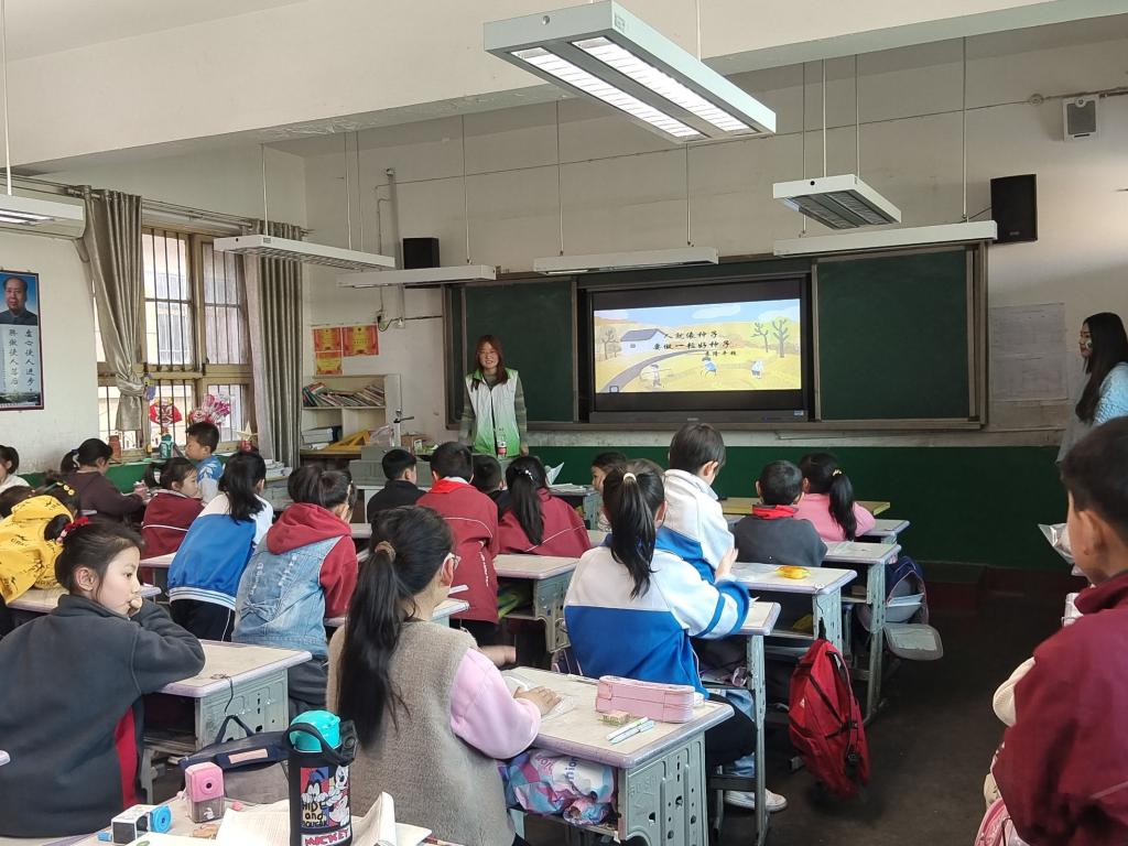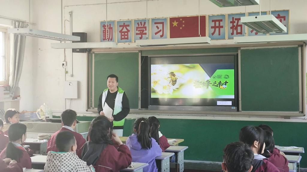 在四、五年级,志愿者以《蜜蜂之树》为主题,为小朋友们介绍了蜜蜂的特征、生活习性以及如何授粉等知识,告诉小朋友们环境保护与蜜蜂生存密不可分。只有加强环境保护,营造适宜的生态环境,才能为蜜蜂创造更为理想的生存环境。