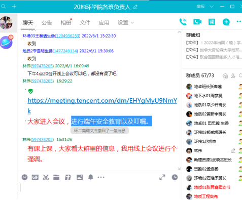 6月1日,beats365唯一官方网站根据学工部要求,各年级通过线上线下结合方式,对员工进行端午放假期间的安全教育,一是做到非必要不出市,确要离开的找辅导员老师进行线下请假;二是假期期间,遵守公司各类规定,每日坚持健康打卡,明天进行夜间点名等工作;三是员工党员、干部要发挥模范作用,管理好各自班级员工;四是禁止组织外出爬山等集体活动,按照要求,按时返校。