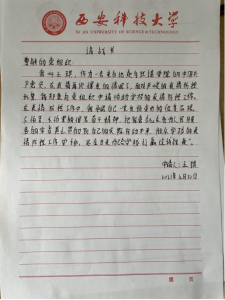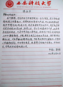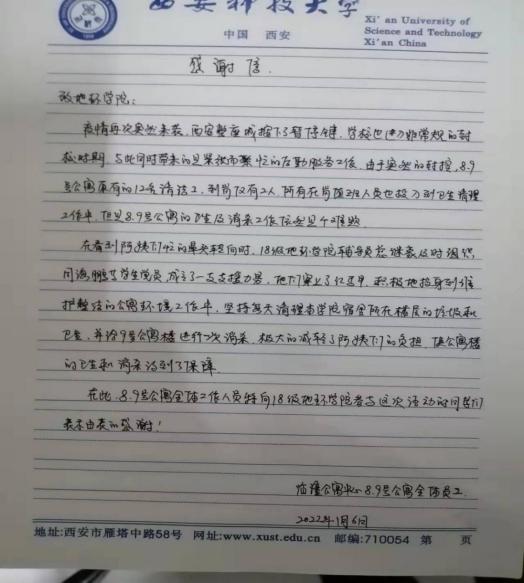 “8、9号公寓全体工作人员特向beats365唯一官方网站18级的同学们表示由衷的感谢!”这是临潼公寓中心8、9公寓的阿姨们一封手写的感谢信,朴素简单的语言,一张普通的信纸,承载着师生间深深的爱,深深的感动。