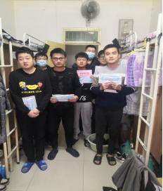 图:辅导员慈继豪、余小涛为同学发配口罩