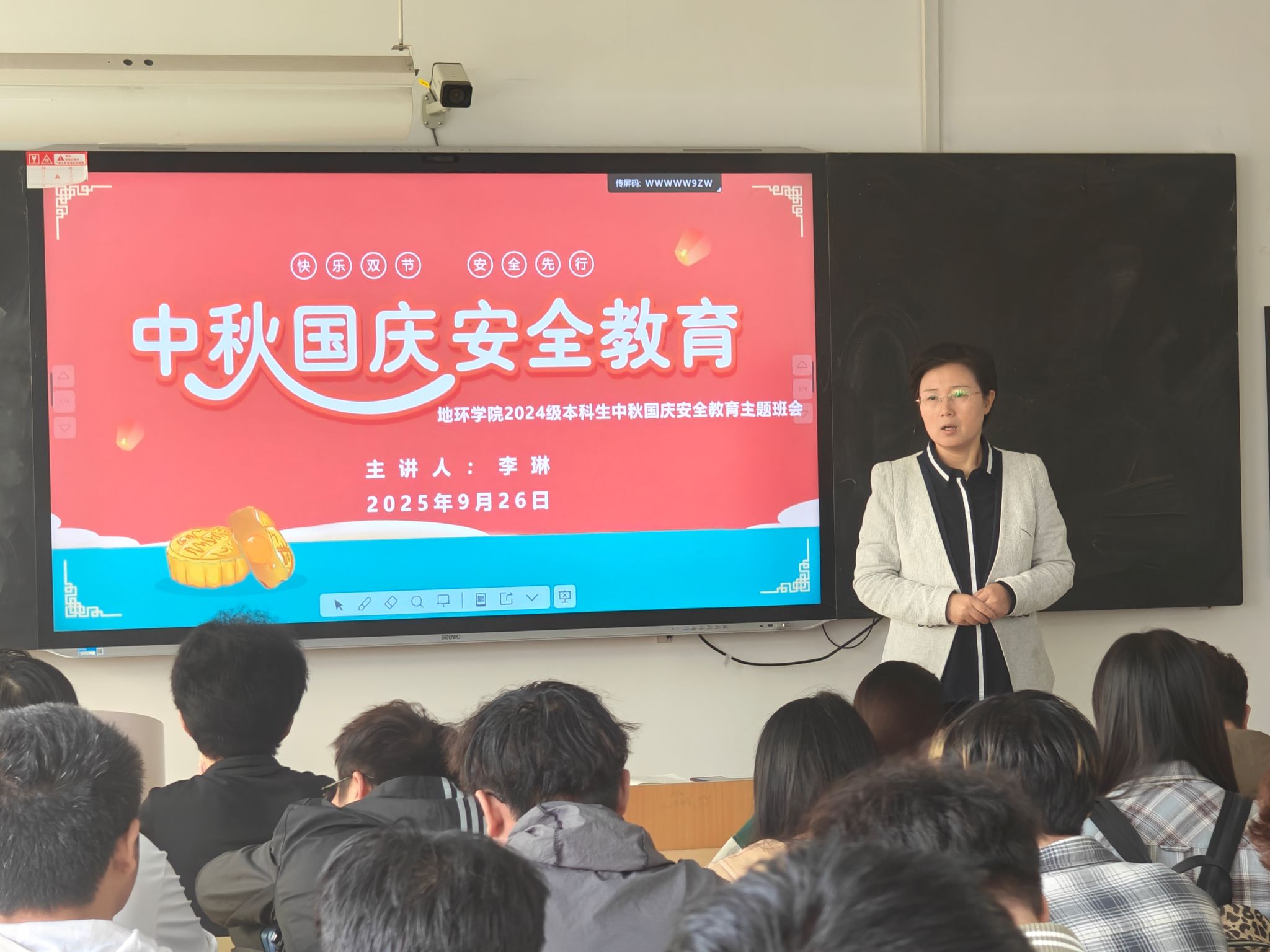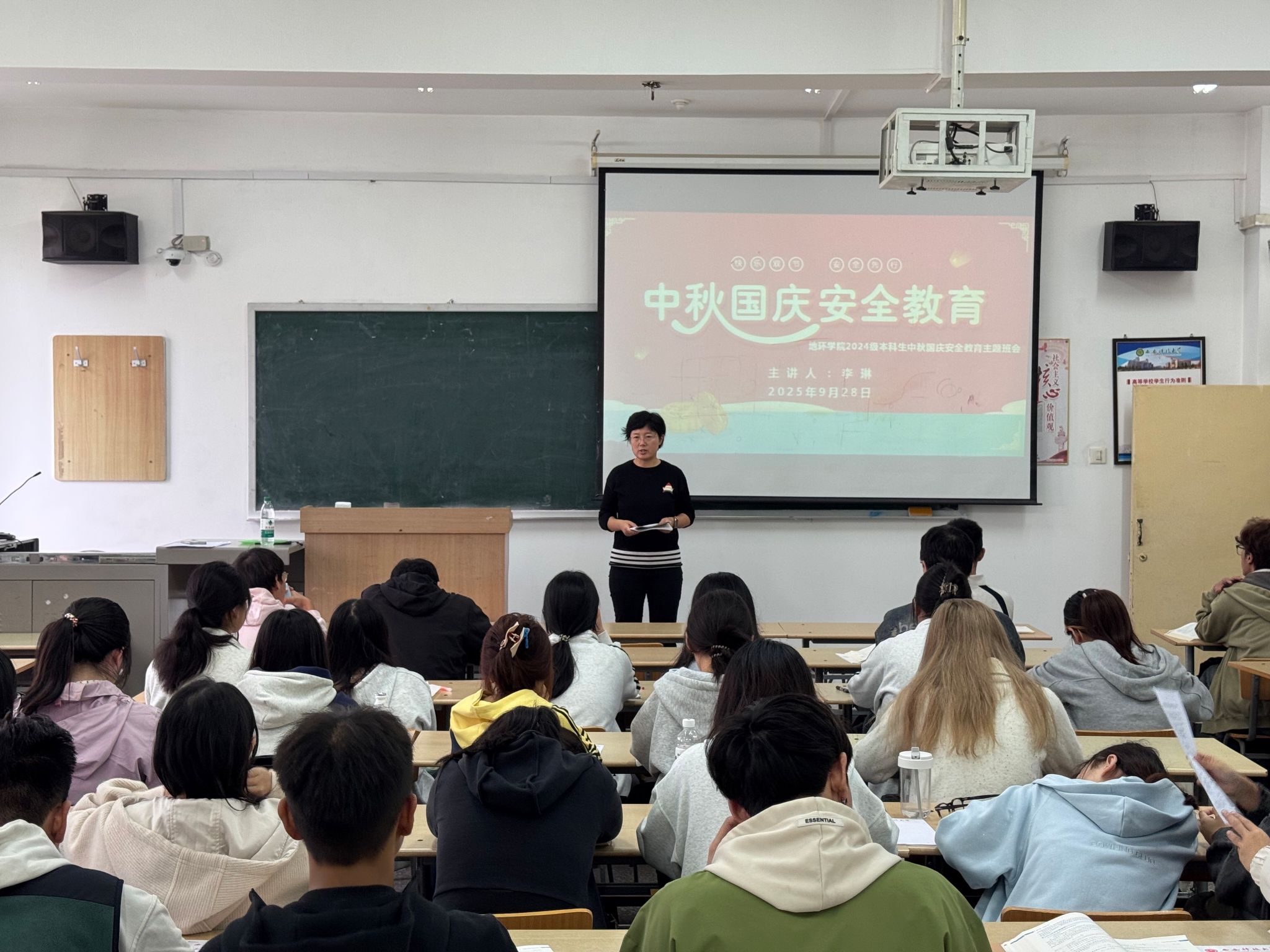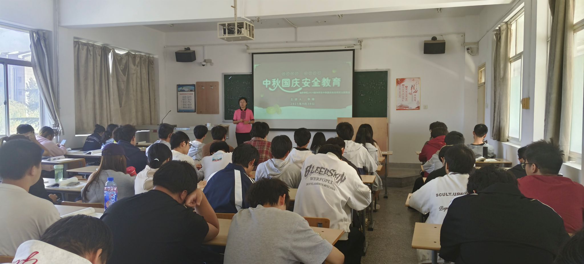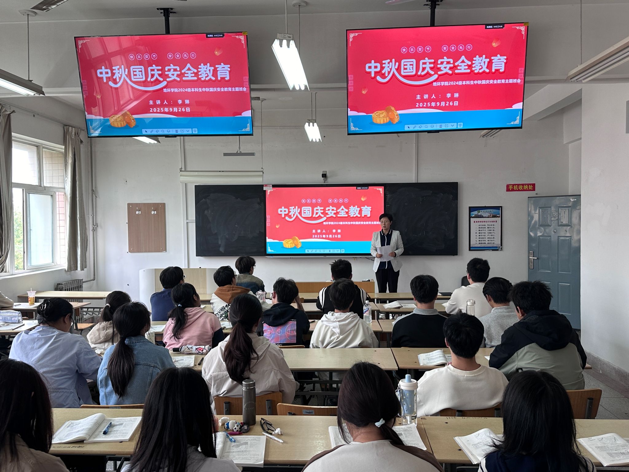 国庆中秋双节临近,为守护2024级本科生假期安全,9月26日至30日,公司学工办主任、2024级辅导员李琳分批次在1教413、1教505、11教501等教室,为9个班级开展假期安全教育主题班会,从七大维度送上“安全锦囊”。