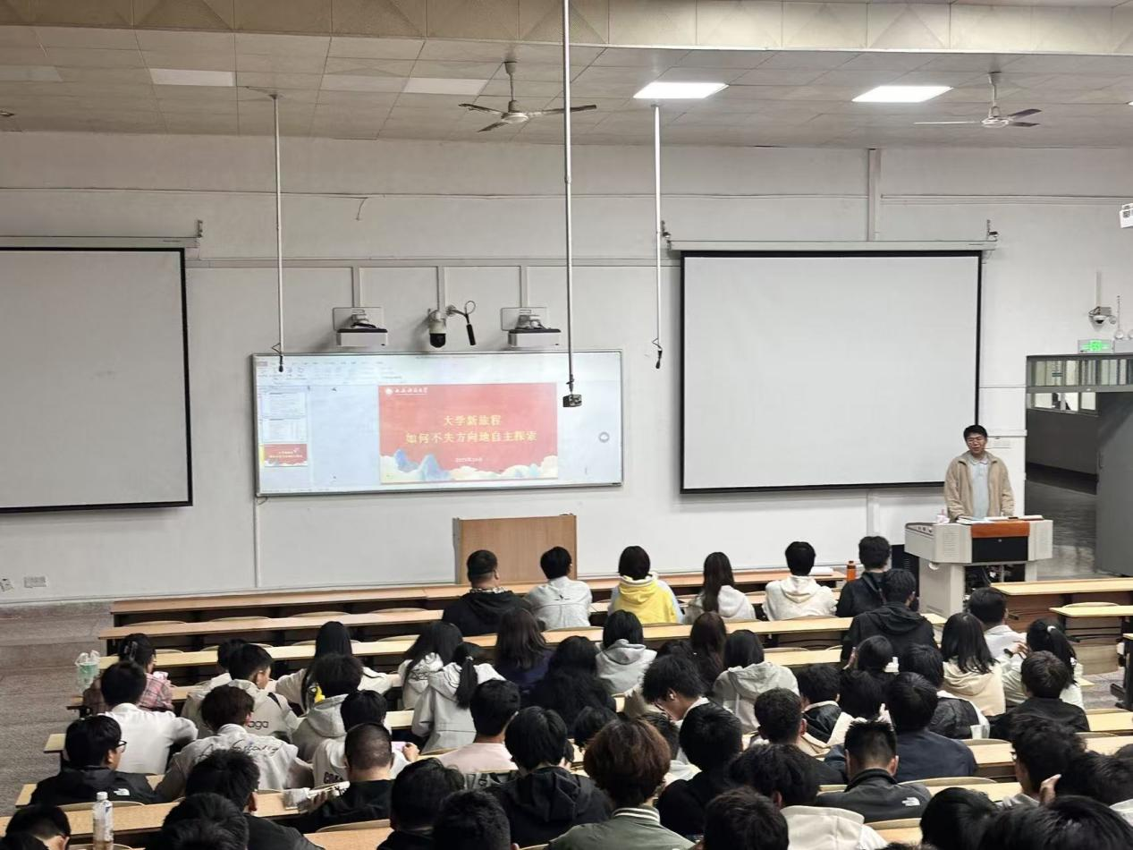 年级会围绕“如何避免盲目跟风、如何在自由中把握方向、如何实现知行合一”等核心问题展开。周佳瑞结合《大学新旅程如何不失方向地自主探索》一文中的典型案例与专家观点,引导同学们反思入学以来的学习状态与心理适应情况,指出当前新生中常见的两种倾向:一是“过度计划”,陷入“刷分”“策略性选课”的焦虑;二是“自由失焦”,因缺乏目标而虚度光阴。