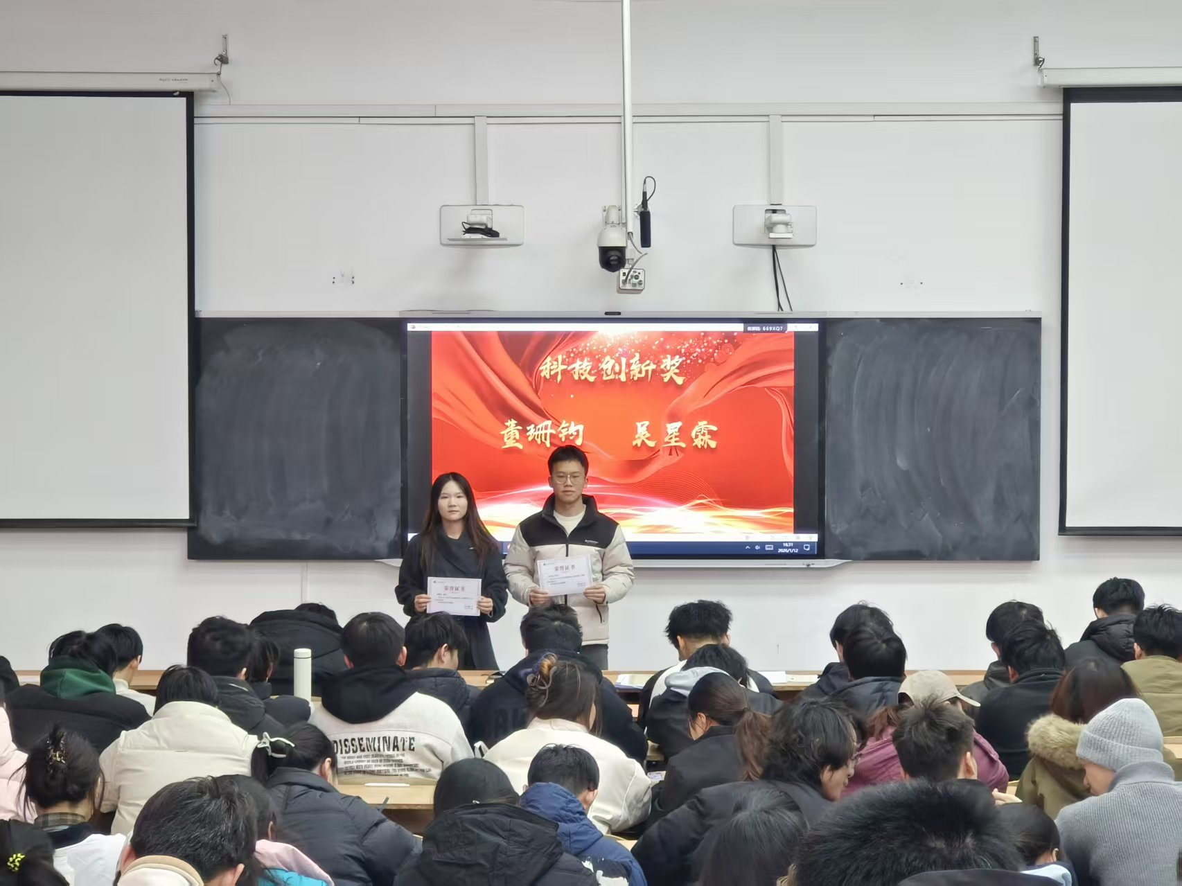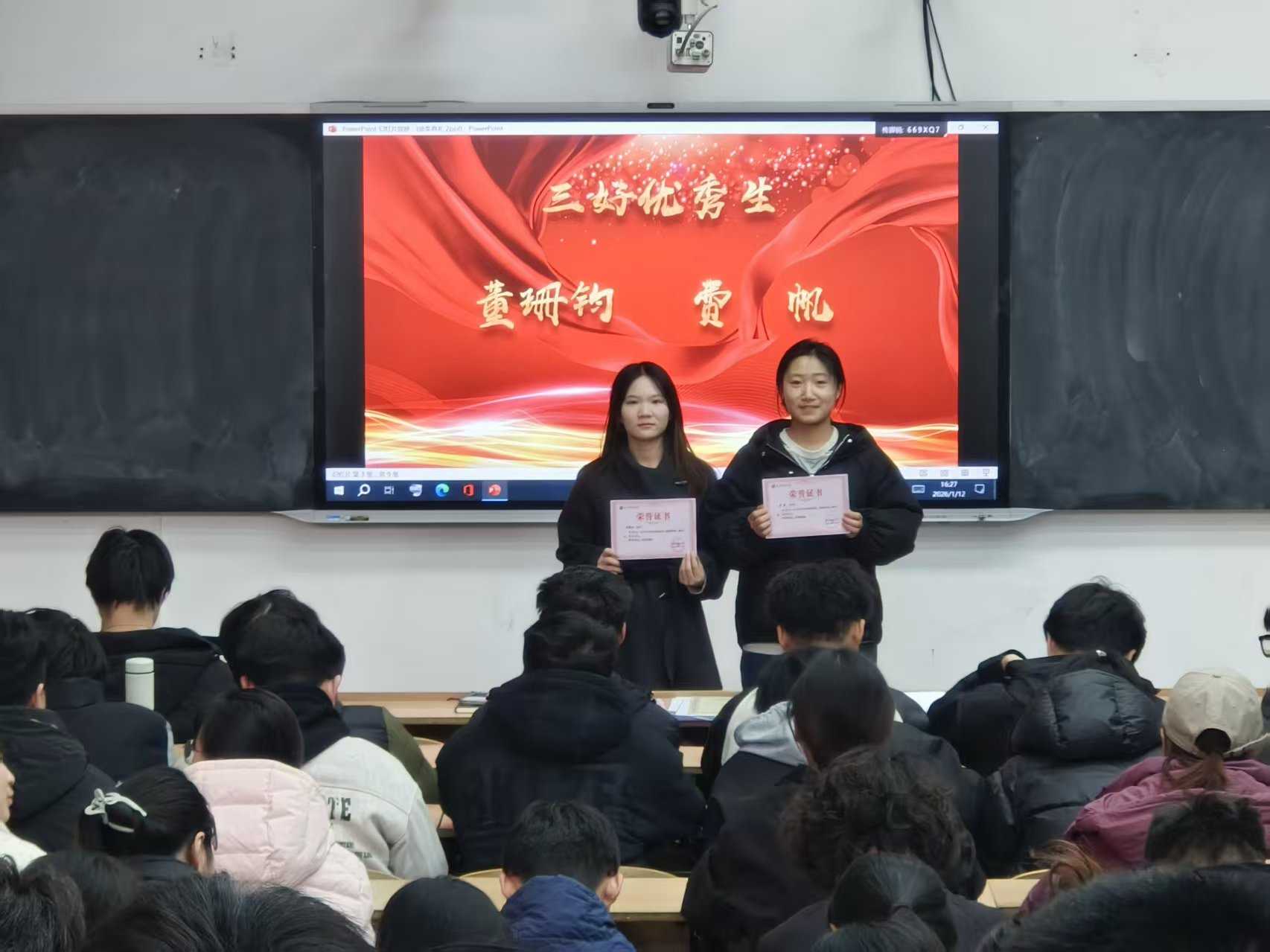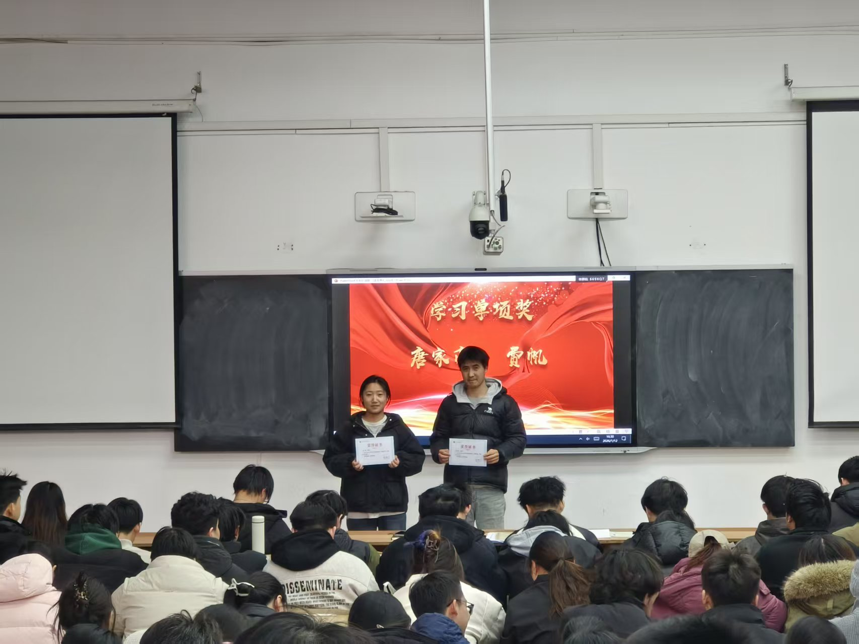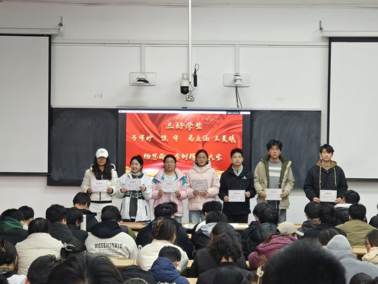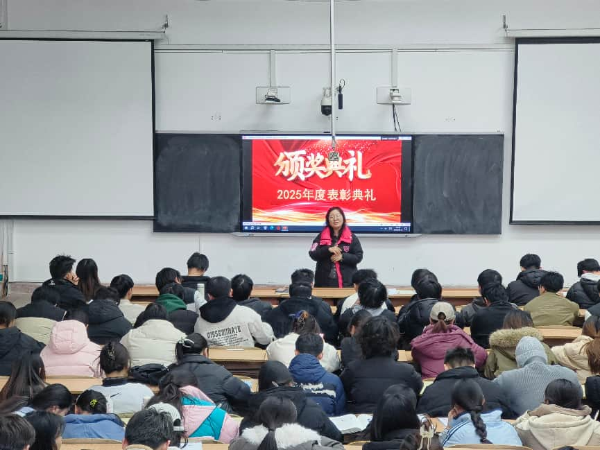 为表彰先进典型、鲜明树立学习标杆,进一步凝聚全体学子的奋进力量,营造比学赶超、笃行实干的优良氛围,1月12日,公司2023级本科生2025-2026学年第一学期表彰大会在3教217教室举行。2023级全体本科生参会,辅导员韩蕊主持。
