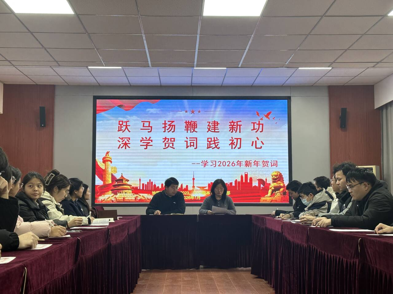 1月4日,2023、2025级本科生党支部以“跃马扬鞭建新功 深学贺词践初心”为主题,在11教322会议室开展2026年新年贺词专题学习,党支部全体党员及部分员工干部参加,会议由支部书记韩蕊主持。