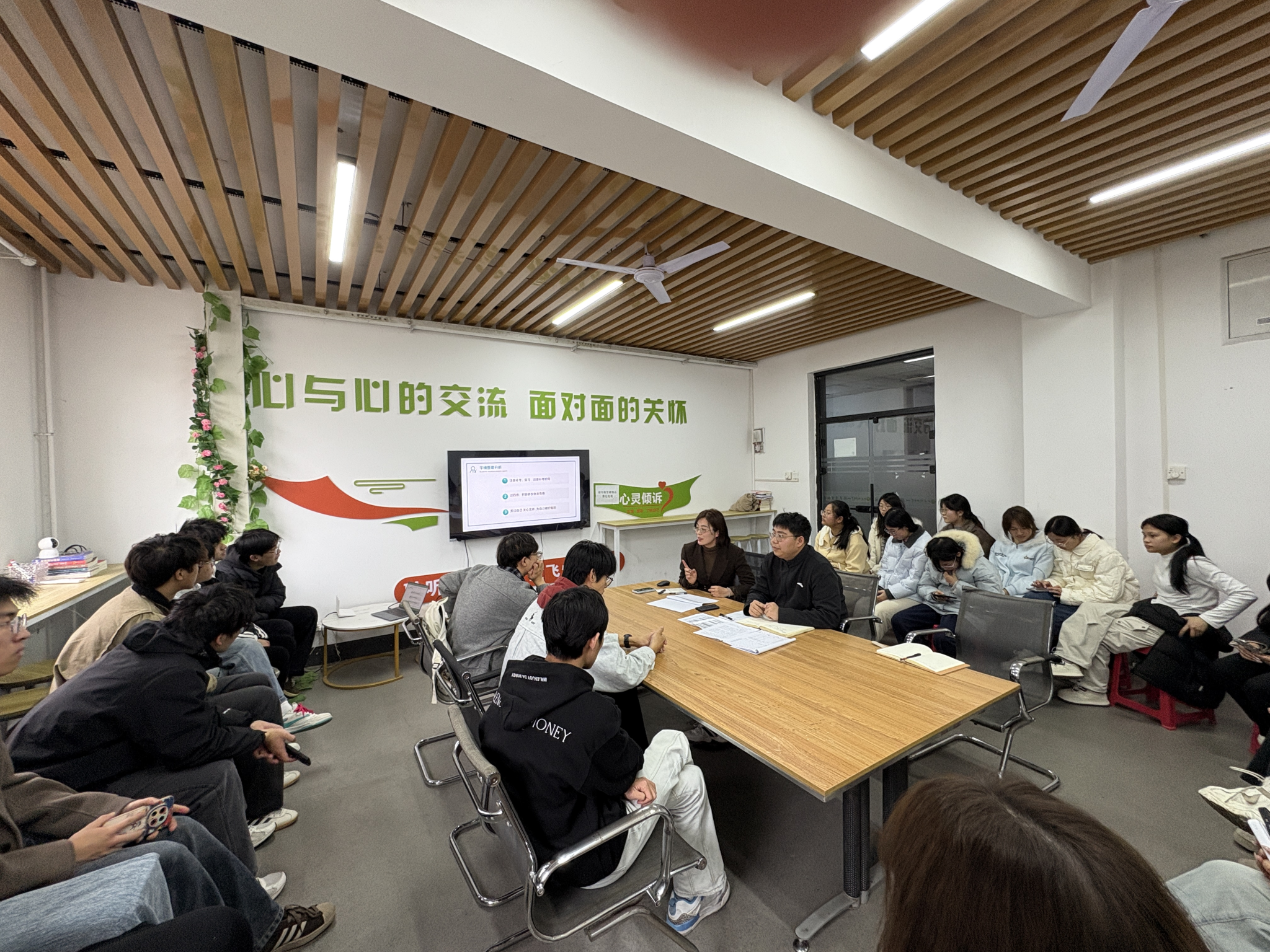 在交流环节,同学们结合自身实际,围绕学习方法、课堂参与、时间管理等问题进行了坦诚交流,肖乐乐逐一给予耐心指导。
