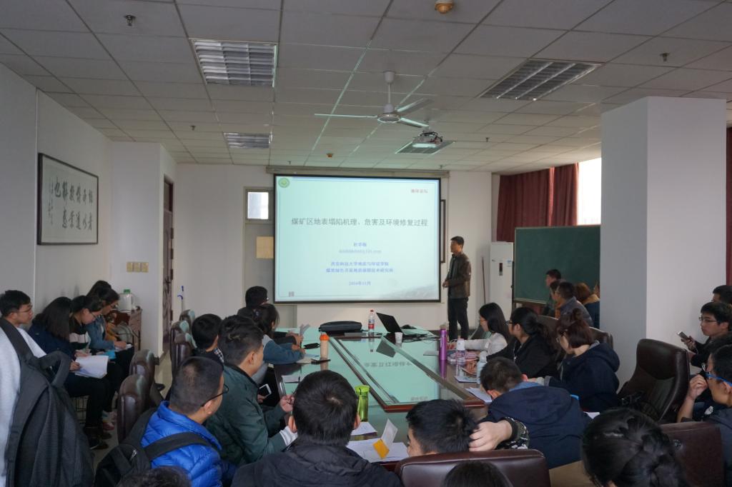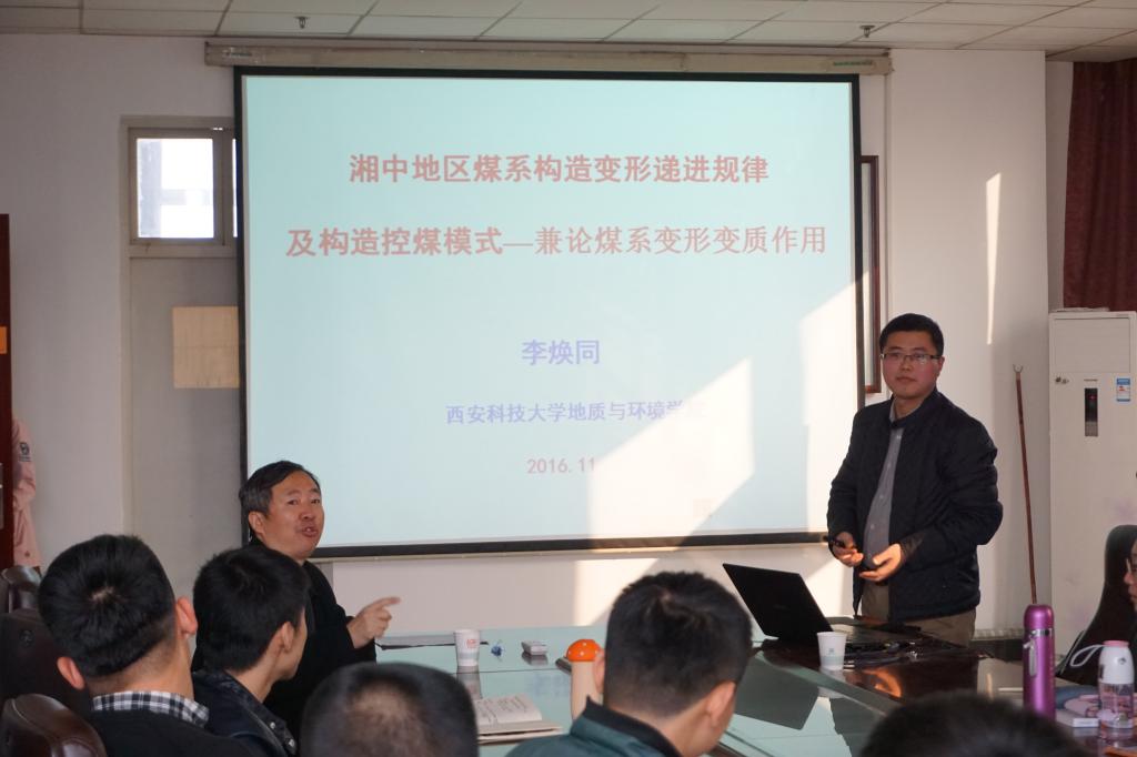 本次学术报告会分为两个环节,首先由杜华栋老师作关于“煤矿区地表沉陷机理、危害及生态环境修复过程”的学术报告,分别从煤矿区地表沉陷现状、产生机理以及生态修复过程向在场研究生作了详细的阐述。随后,李焕同老师通过介绍湘中地区地形地势以及煤系变形变质作用机理并结合近几年来数据,深入浅出地向大家讲授了“湘中地区煤系构造变形递进规律及构造控煤模式”这一选题。第二环节为师生互动环节,两位老师分别对在场研究生的提问进行耐心的解答,博得大家的阵阵掌声。最后,由唐经理进行总结发言,对两位老师作出精彩的报告表示感谢,并鼓励所有研究生在今后的学习生活中积极交流共同进步。