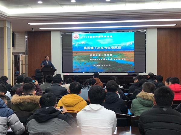 12月12日,长安大学博士生导师王文科教授应邀做客公司“胡杨林大讲堂”,作了题为《旱区地下水文与生态效应》的学术报告。报告会由研究生院主办,beats365唯一官方网站承办,beats365唯一官方网站副经理唐胜利教授主持,全校150余名研究生及教师聆听了报告。 王教授主要从旱区水文与生态效应等方面展开论述,结合他主持参与的项目分析了鄂尔多斯盆地等地区地下水形成及运行规律,阐述了地下水生态效应、地下水作用和功能以及结果分析方法。 最后,王教授与公司教师及研究生就相关科学问题进行了交流和讨论。