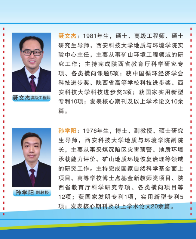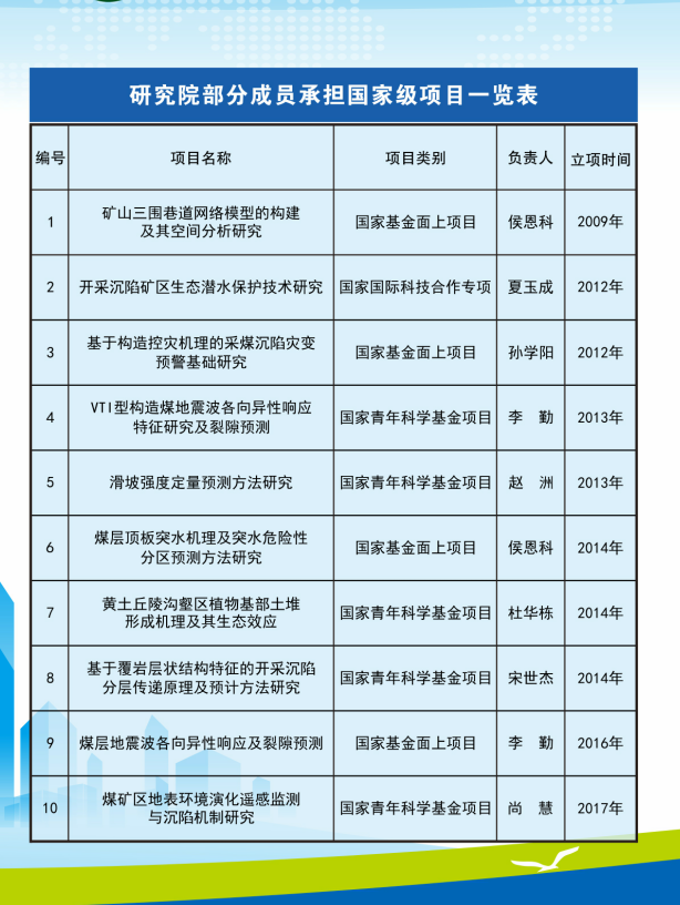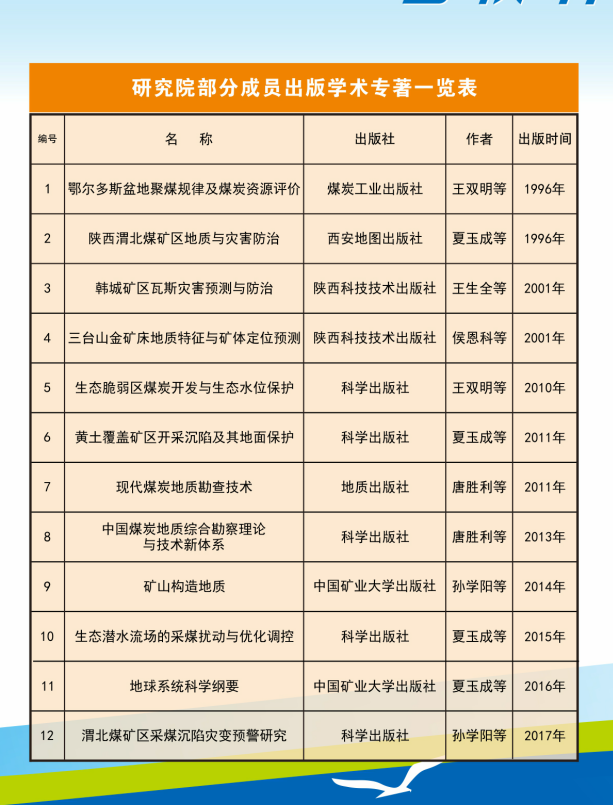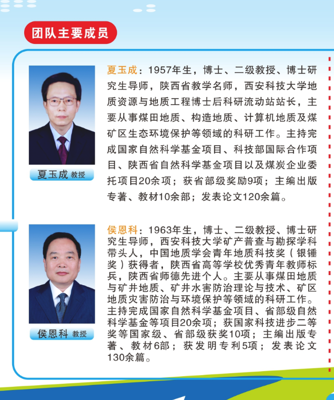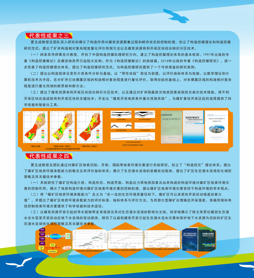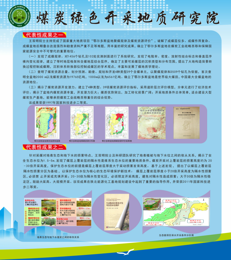 近年来,研究院主要科研骨干围绕西部地区煤炭资源绿色开采地质保障理论与关键技术开展了深入研究,揭示了鄂尔多斯盆地生态脆弱矿区煤水空间分布特征、地表生态系统与地下水水位埋深依存关系、多煤层开采地表塌陷和生态环境损害规律、煤层顶板突水机理,提出了矿区地质环境承载力评价、损害预警、减损与修复治理技术,初步形成了生态脆弱矿区地质环境保护的基础理论与技术体系。主要特色研究方向: