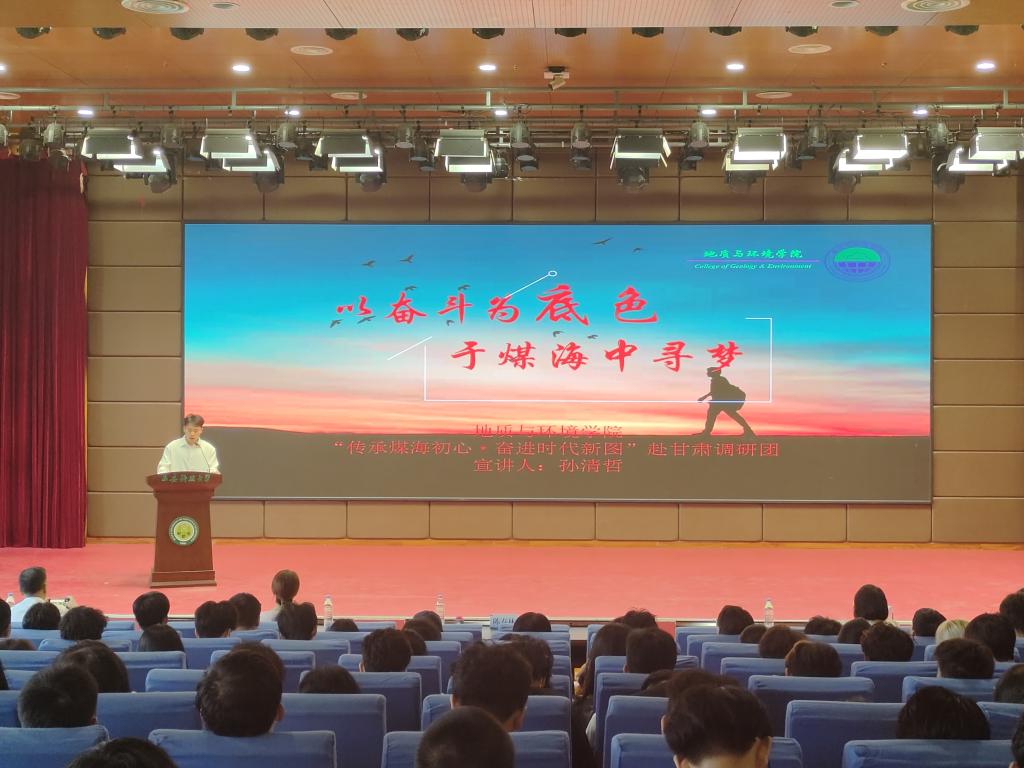 孙清哲同学以“以奋斗为底色,于煤海中寻梦”为主题,分享自己作为队长带领团队赴甘肃煤炭企业社会实践的经历与感悟。实践团深入甘肃靖煤能源有限公司旗下的魏家地煤矿和大水头煤矿进行了实践调研,学习煤矿的建设情况、安全生产以及企业文化,同时深入井下生产一线,亲身体验智能化矿井开采的高效与便捷。