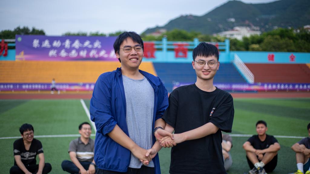 考取长安大学研究生的贾政杨现场拥抱了考取中国矿业大学(北京)的田浩同学,以感谢四年舍友情深和兄弟情谊。