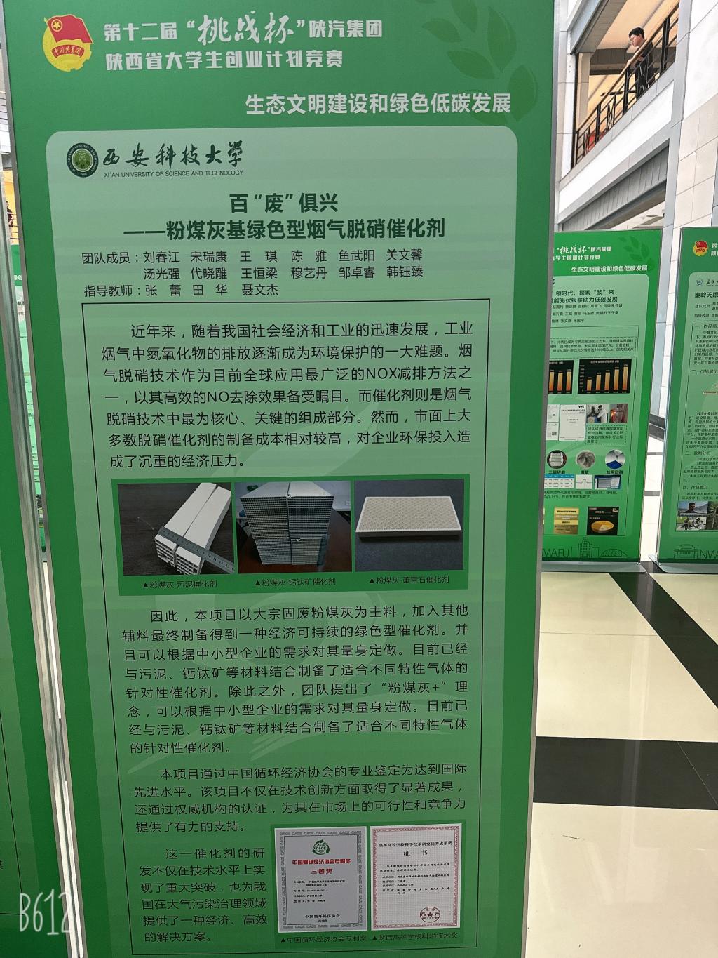 近日,第十二届“挑战杯”陕汽集团陕西省老员工创业计划竞赛在西北农林科技大学圆满落幕。公司在张蕾、田华、聂文杰老师的指导下完成的参赛项目《百“废”俱兴——粉煤灰基绿色型烟气脱硝催化剂》荣获陕西省级银奖。