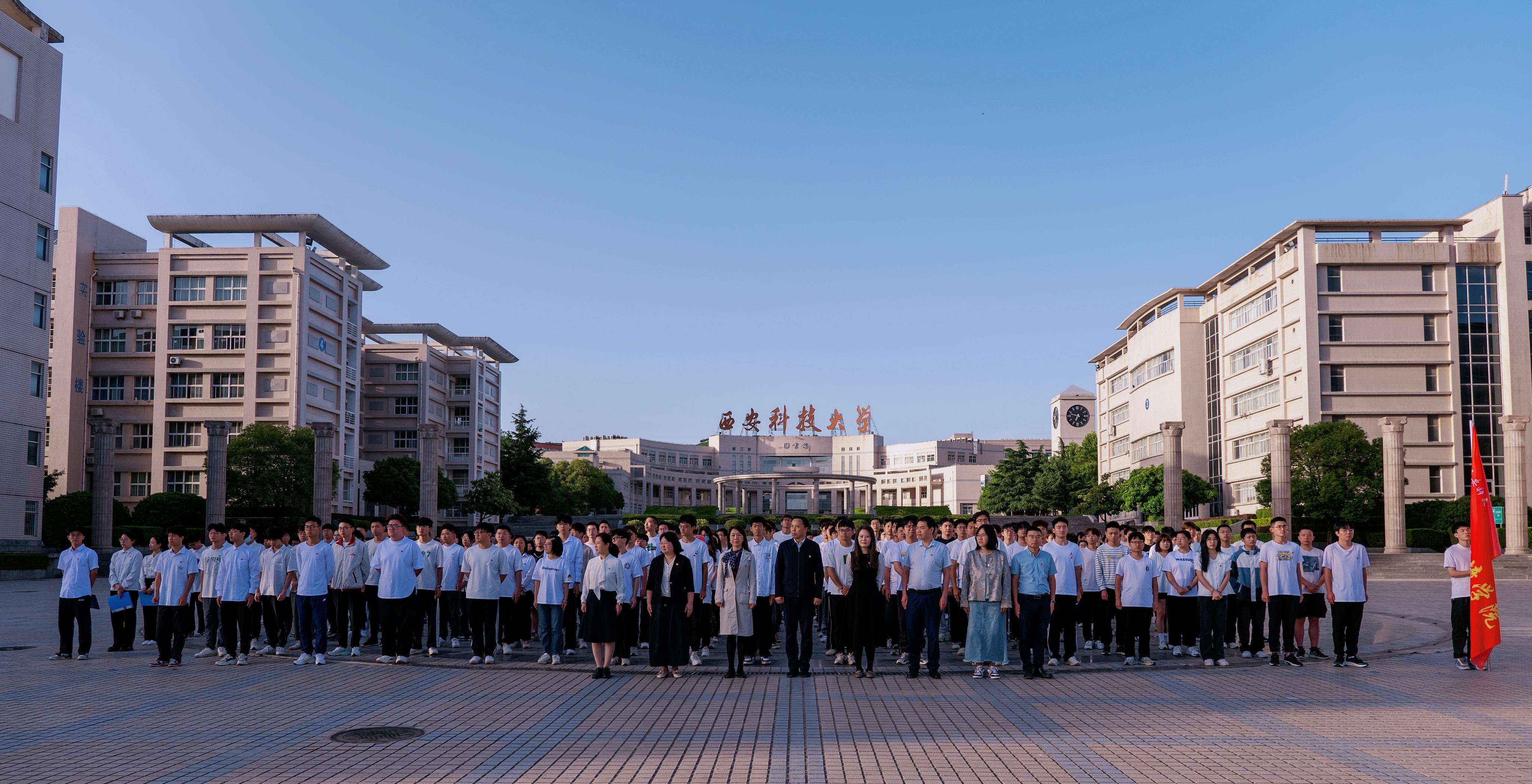 6:45分,仪式在清晨阳光的映衬下举行,雄壮的国歌响彻中心广场,全体师生向国旗行注目礼,齐唱国歌。