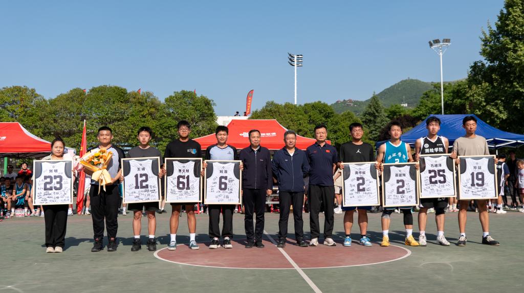 中场休息时还举行了赠送球衣仪式,校体育部负责人向即将毕业的校篮球队队员赠送球衣。来兴平、陈春林与他们合影留念,勉励他们在今后的学习、生活中继续发扬“励志图存 自强不息”的公司精神,发扬在校篮球队的团结协作和顽强拼搏精神,在未来人生路上继续奋勇前进。