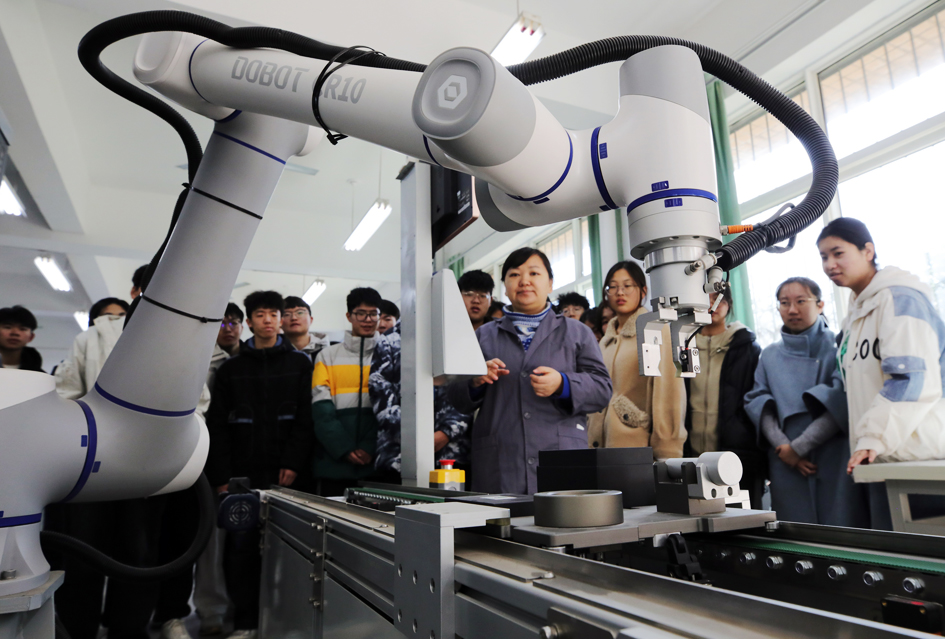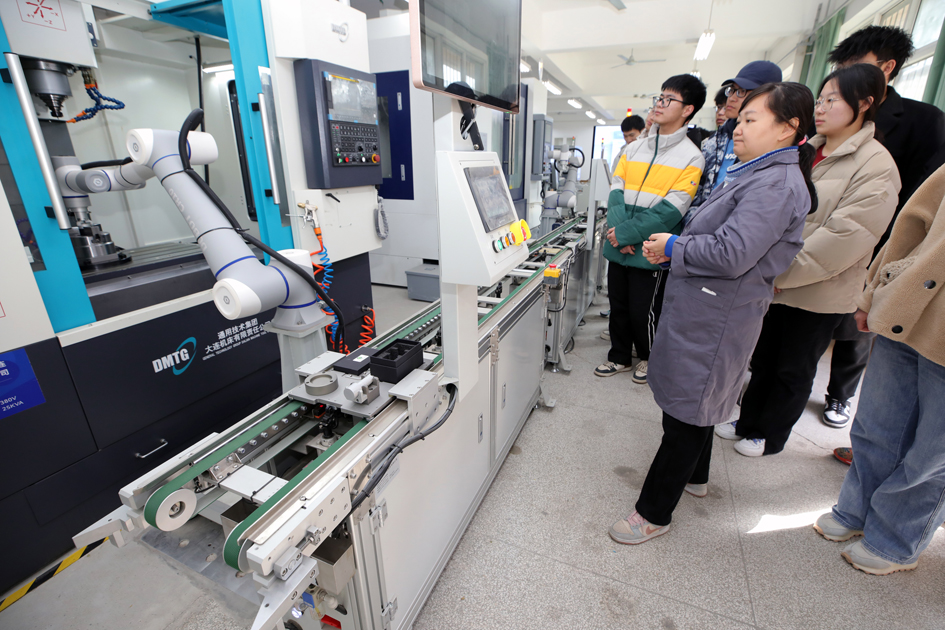 ▲3月8日,BEAT365英国官网网站解晖老师和智能制造2023级员工在智能制造实验室做工业机器人在数控加工中的应用实验。